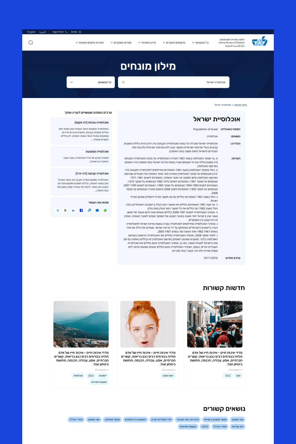 הלשכה המרכזית לסטטיסטיקה (הלמ"ס) היא המקור הממשלתי הרשמי לנתונים על ישראל, המספקת מידע חיוני לקבלת החלטות בממשלה, בעסקים, באקדמיה ובציבור. פרויקט זה התמקד בעיצוב מחדש של אתר הלמ"ס כדי ליצור חוויה מודרנית, נגישה ואינטואיטיבית. העיצוב החדש כולל ממשק רספונסיבי, ניווט משופר, כלים חיוניים מודגשים ונגישות משופרת בשלוש שפות. המטרה היא להפוך נתונים סטטיסטיים לזמינים בקלות וידידותיים למשתמש, ולשפר את החוויה עבור מאות אלפי המבקרים המסתמכים על האתר מדי יום.