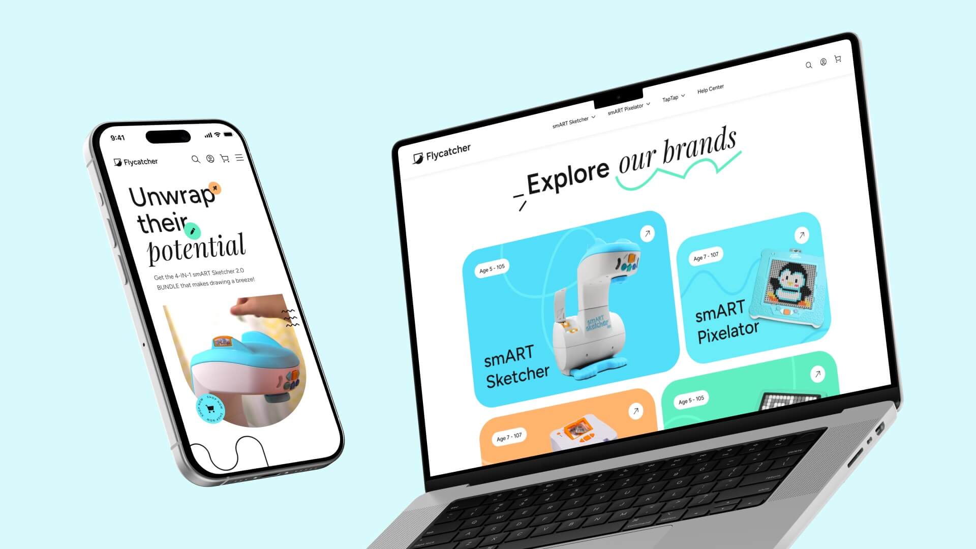 יצרנו שפה מותגית מחודשת ומדויקת שמאחדת את כל קווי המוצרים תחת זהות אחת ברורה, מודרנית ומעוררת אמון. הדגשנו את הייחודיות של Flycatcher כמותג יצרני – כזה שחושב, חוקר, מפתח ומעצב בעצמו את המוצרים והחוויה הדיגיטלית סביבם, ולא עוד "עוד חנות צעצועים". עיצבנו אתר חדש שמחבר בין ערכי המותג – חדשנות, בטיחות, למידה וכיף – לבין חוויית משתמש חכמה ומזמינה, המדברת בשפה עכשווית להורים בני דור המילניום וה-Z, ומביאה לידי ביטוי את איכות המוצרים, החשיבה שמאחוריהם, ואת הערך המוסף שהם מעניקים לילדים ולהורים כאחד.